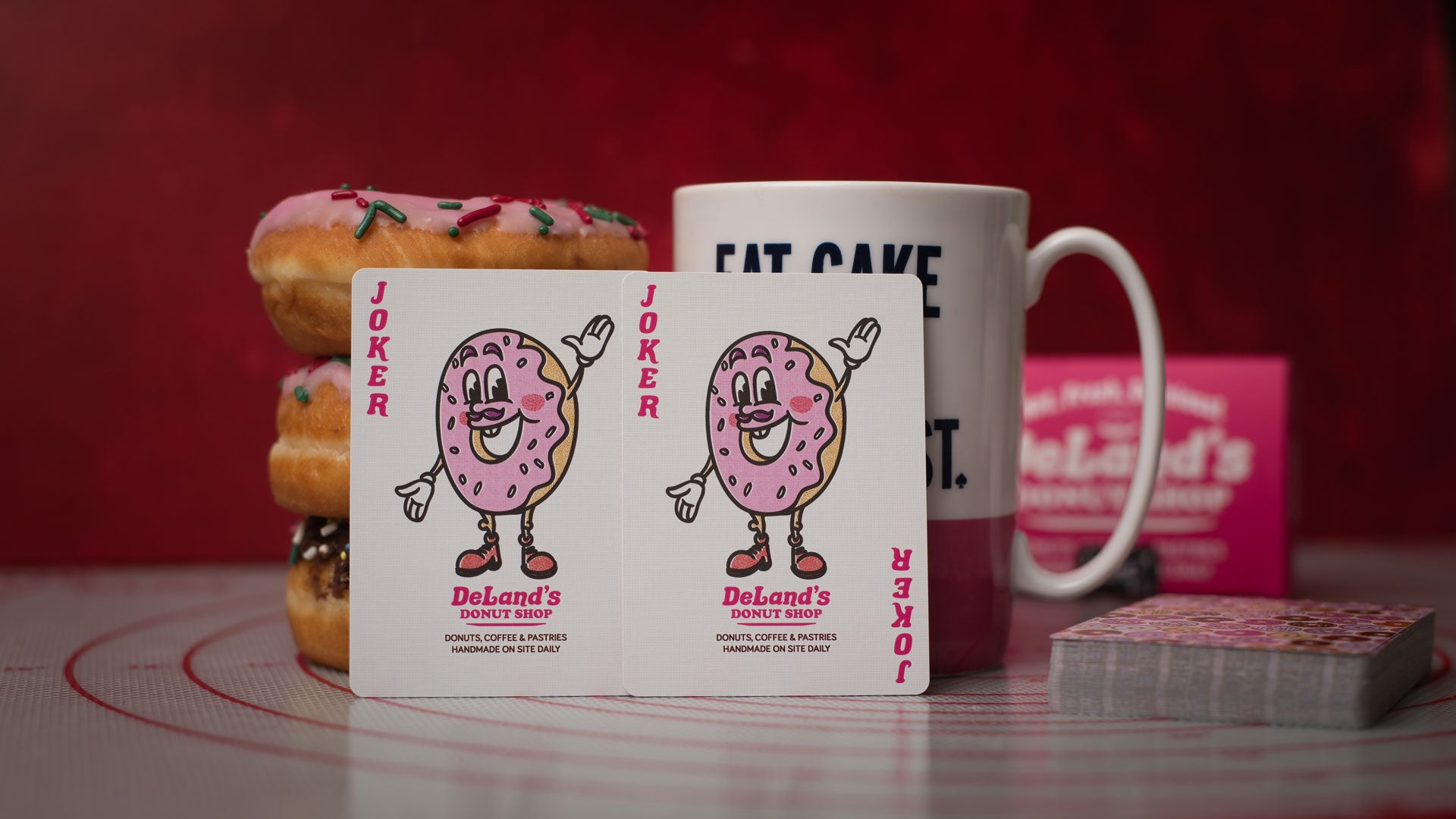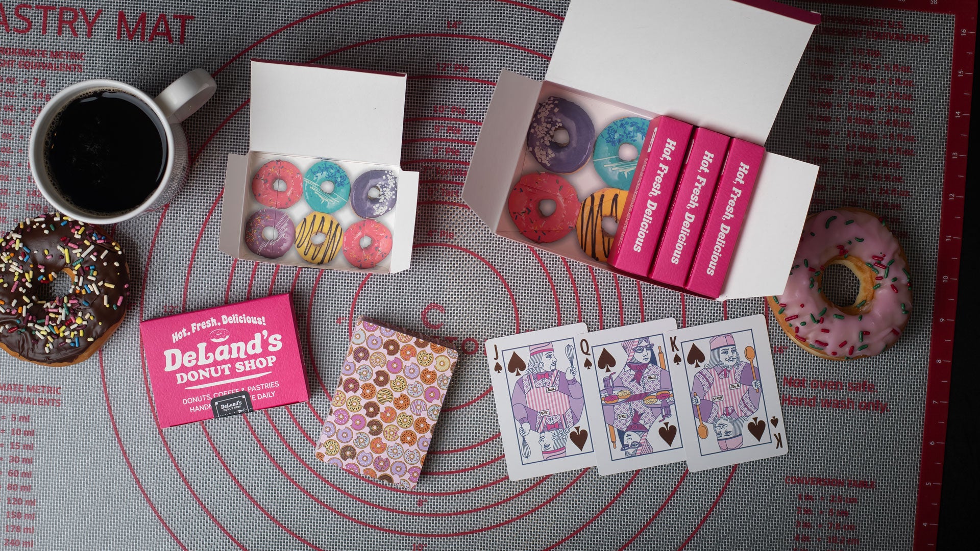 The whole package is topped off with a custom sticker seal, individually numbered out of 3,000. DeLand's Donut Shop playing cards are available singly, or in collector's 6-pack boxes.