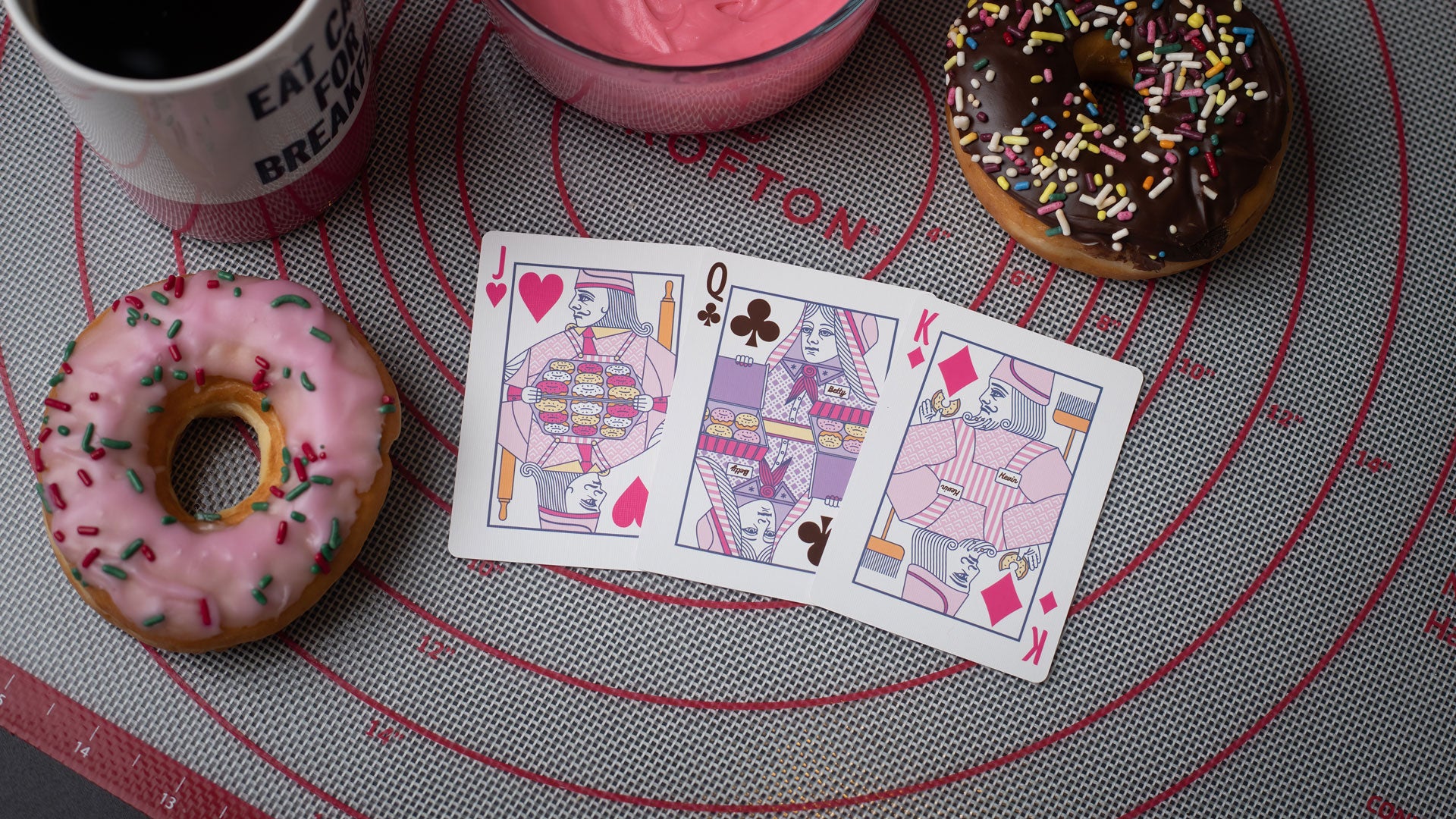 The faces feature a bright pink & chocolate brown color scheme, with sprinkles on the number cards. The court cards have been customized as bakery employees, ready for service. Two identical jokers with a donut mascot are included, as well as a double-backed gaff card for magic tricks.