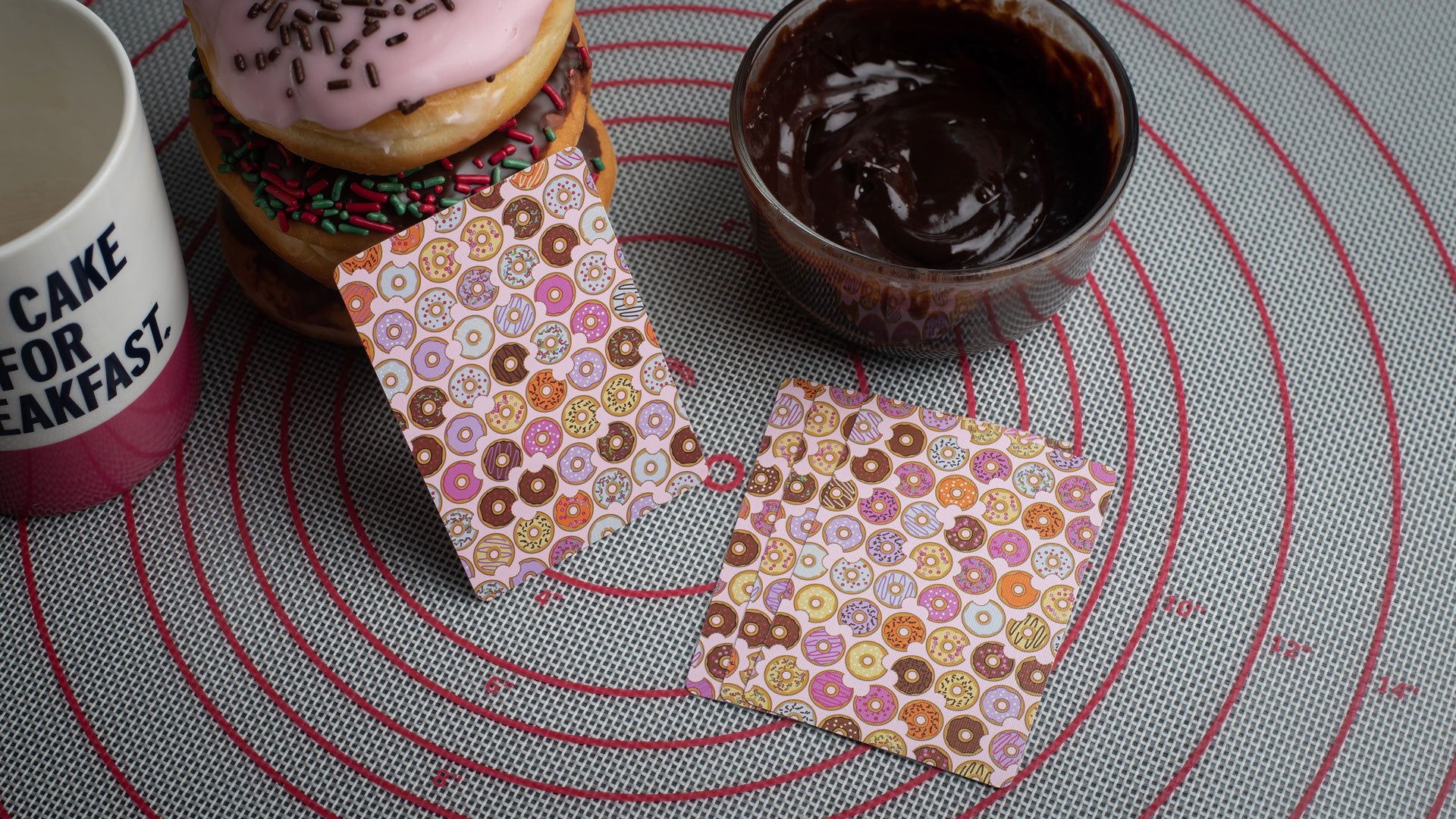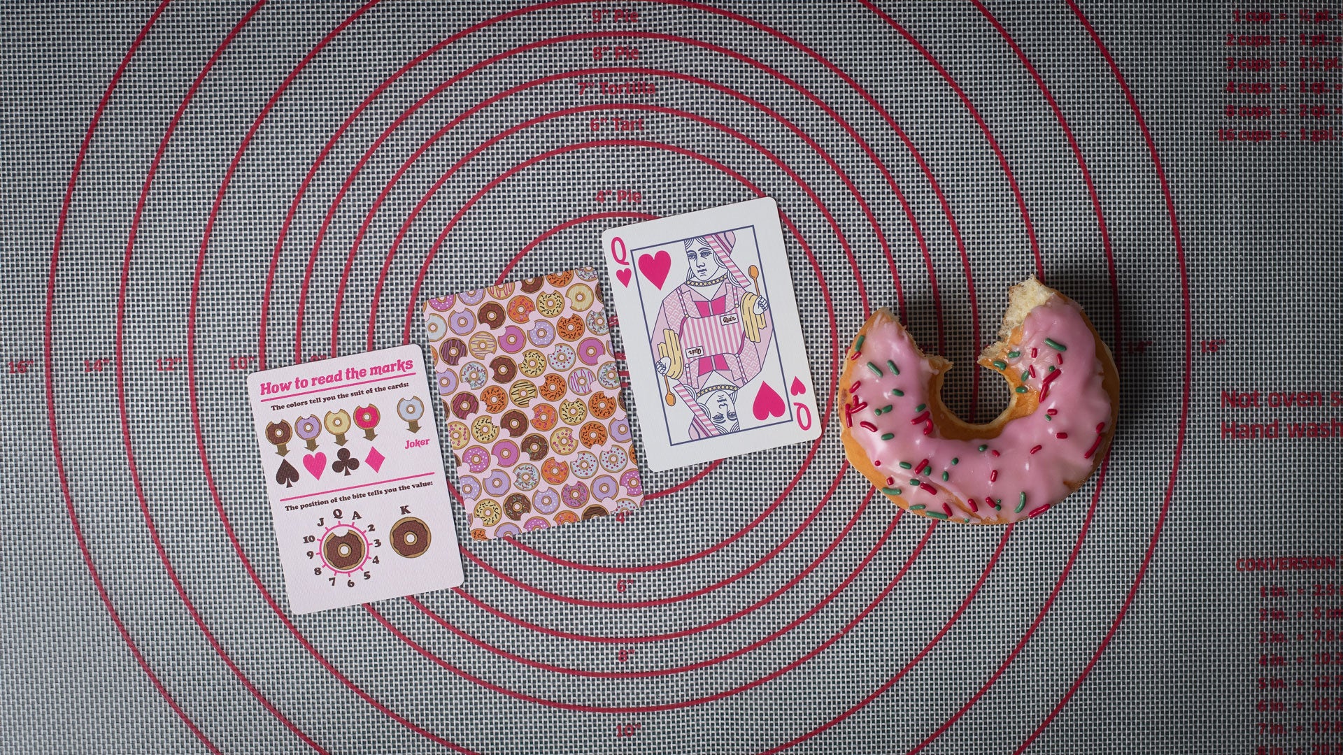 The card backs have a full-bleed borderless design, covered in dozens of appetizing donuts. Utilizing a clock-style bite system along with color-coded icing, you'll be able to discern both the suit & value of any card in the deck just by glancing at the back. Because of the size of the marks and the color-based suit system, the deck can be read from quite a reasonable distance!
