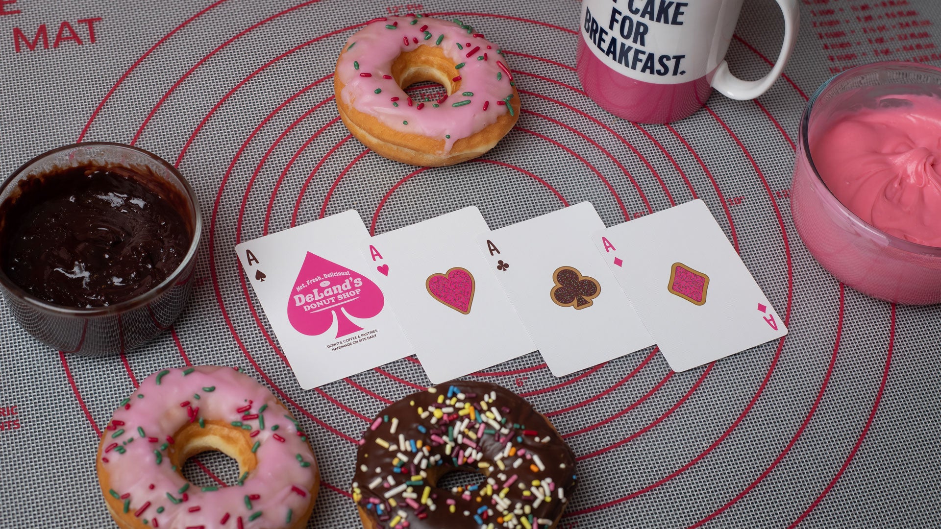 DeLand's Donut Shop playing cards look like a souvenir deck from your favorite mom & pop bakery, but they hide some diabolical secrets within!