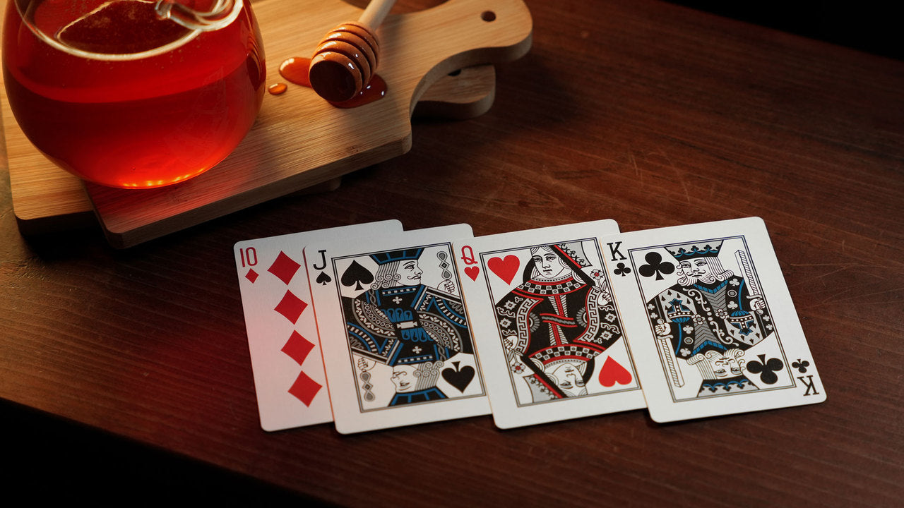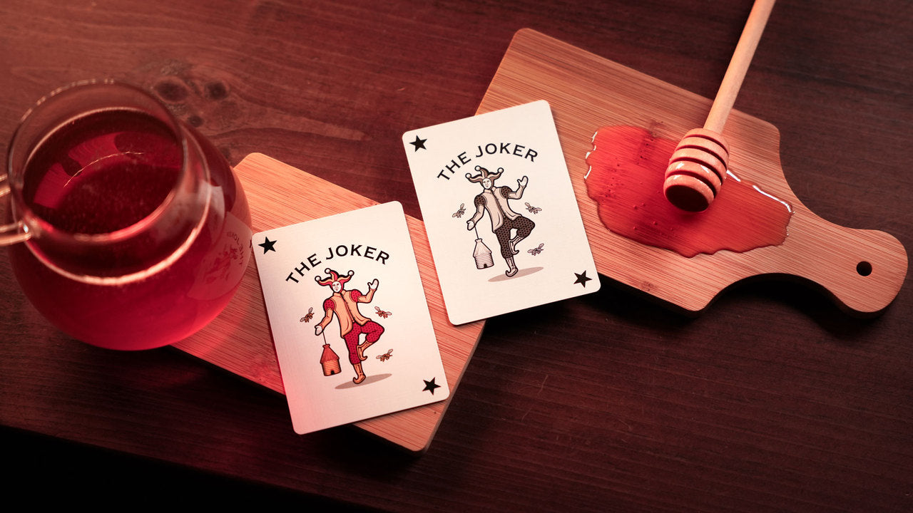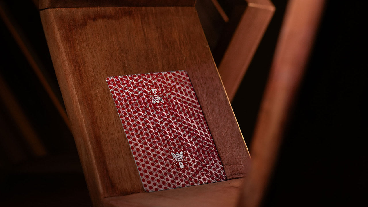 In addition to the custom back design and tuck box, each Honeybee Worker deck includes standard court cards with a custom color scheme, two custom jokers, an elegant custom Ace of Spades, and two bonus gaff cards.