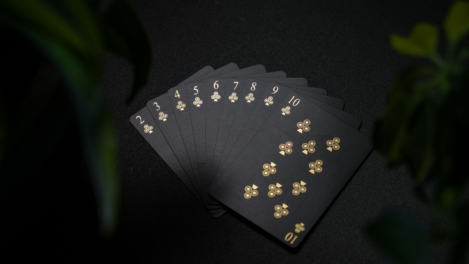 The cards have full-bleed black ink on the faces and the backs, but all of the design work is crafted from foil. The back design has a detailed geometric layout with leaves & flowers growing from the rigid structure. The backs are stamped from beautiful gold foil.
